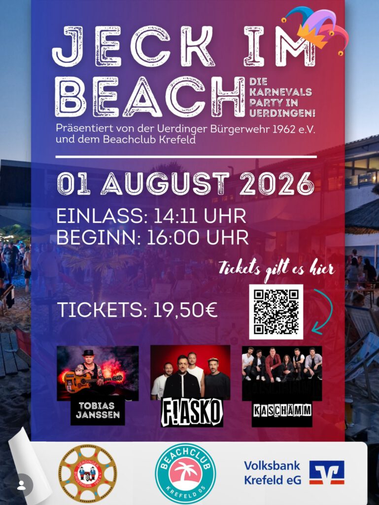 Unsere Sommerpause hat ein Ende. In diesem Jahr findet in Partnerschaft mit dem Beachclub Krefeld wieder unsere Partyreihe „Jeck im Beach“ statt.